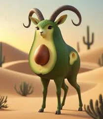 Avocadini Antilopini e una stravagante fusione di un avocado e un'antilope, con tratti femminili tra cui ciglia e un sorriso. In piedi in un ambiente desertico, questo personaggio rappresenta una famiglia di ibridi frutta-animale con varie variazioni di frutta.
